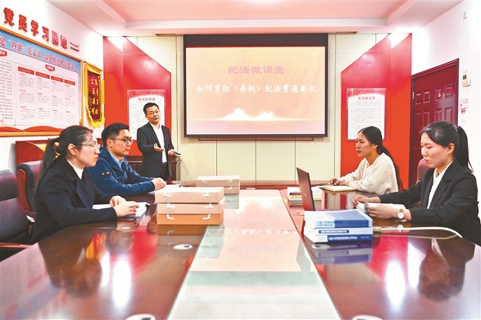 江西省新余市紀委監(jiān)委不斷強化紀檢監(jiān)察干部對執(zhí)紀執(zhí)法貫通理念的理解運用,建立“通報講評”機制,針對實踐中發(fā)現(xiàn)的難點問題及時分析講解,提升案件辦理質效。圖為該市紀委監(jiān)委案件審理室圍繞新修訂的紀律處分條例,解讀紀法銜接條款的理解運用。黃磊 攝