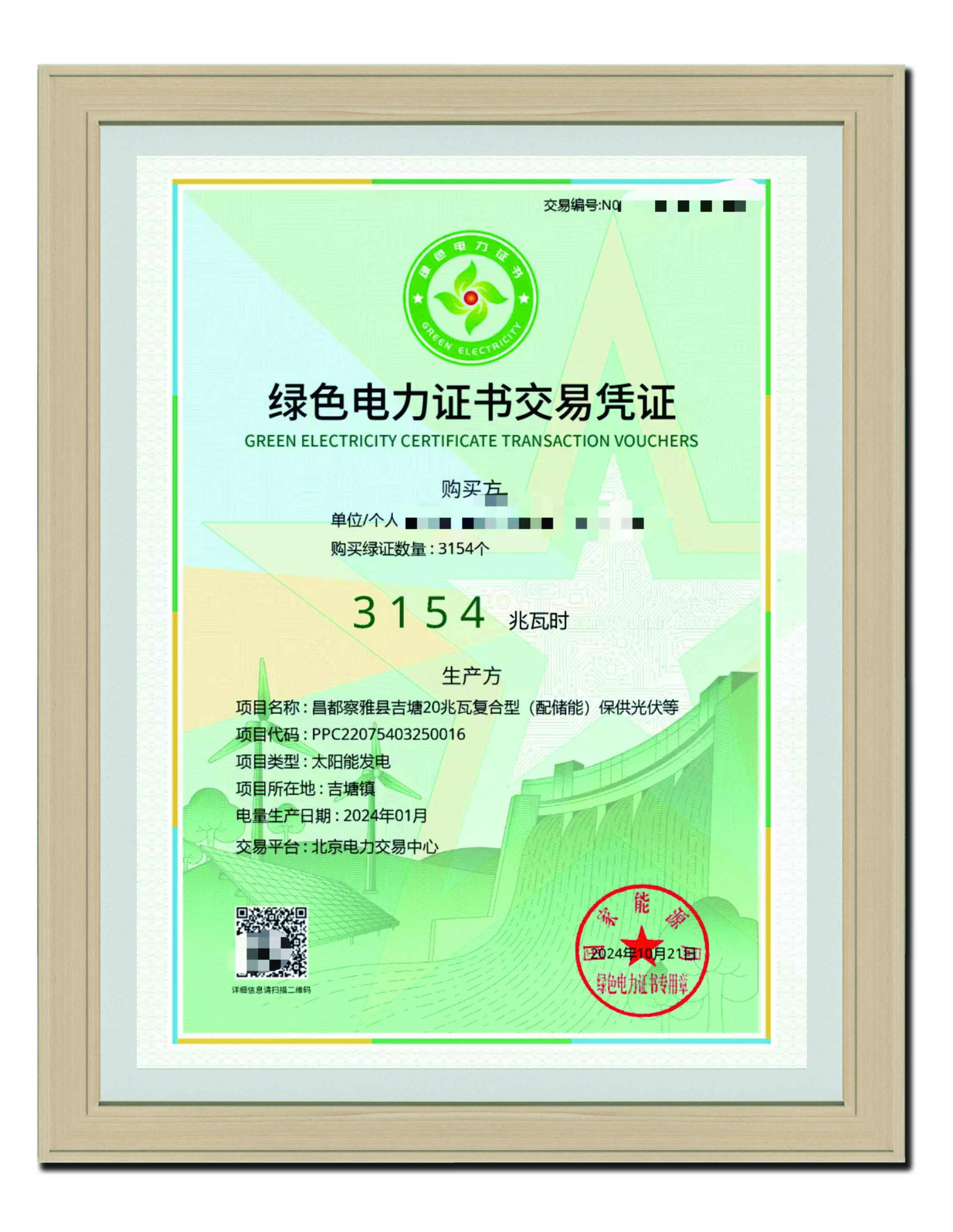 2024年10月21日 綠色電力證書(shū)交易憑證3154兆瓦時(shí)