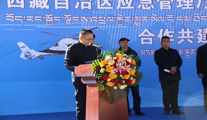 祁騰武代表西藏民航投,對各位領導、嘉賓的到來表示衷心感謝和誠摯歡迎。他表示,西藏航空應急救援基地的建設和揭牌,是貫徹落實習近平總書記關于西藏工作和應急救援體系建設重要指示批示精神,推動自治區(qū)黨委第十一次、第十四次專題會議精神落實落地的重要舉措,為推動我區(qū)不斷健全完善“統(tǒng)一指揮、上下聯(lián)動、空地同、快速反應”應急救援機制和“立體式、全天候、全災種、高水平”綜合應急救援體系邁出了堅實的一步。期待民航投與自治區(qū)應急廳的戰(zhàn)略合作從“心”出發(fā),向新而行,不斷開創(chuàng)新的局面,交出滿意合格答卷。