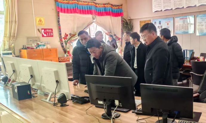 羅布次仁(左二)在滿(mǎn)拉水利樞紐工程調(diào)度室調(diào)研。
