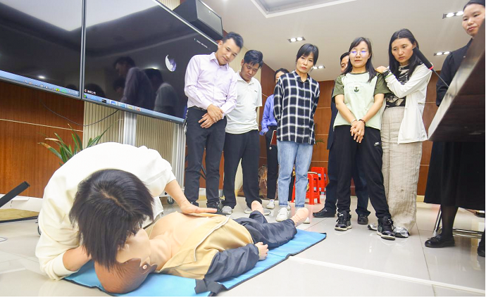 培訓過程中,導師通過示范指導、疑問解答、模擬訓練等方式,著重演示了海姆立克急救法、心肺復蘇操作、防震減災地震自救以及創(chuàng)傷救護等現(xiàn)場救護操作方法,著重強調了應急救護“黃金四分鐘”及心肺復蘇胸外按壓的至關重要性,全體參訓人員在導師的指導下對所學項目進行模擬練習,對不規(guī)范的流程與動作,進行糾正,確保參訓人員真正掌握應急救護技術。
