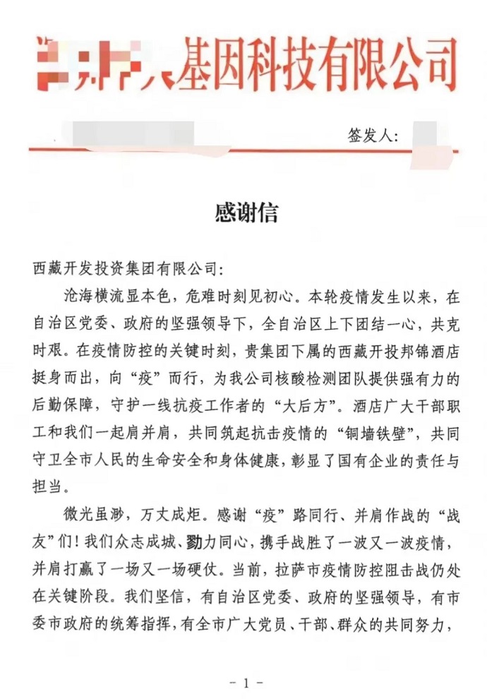 近日,西藏開(kāi)發(fā)投資集團(tuán)有限公司收到某核酸檢測(cè)機(jī)構(gòu)總部發(fā)來(lái)的致西藏開(kāi)投邦錦花園酒店的感謝信,感謝西藏開(kāi)投邦錦花園酒店為該核酸檢測(cè)機(jī)構(gòu)的核酸檢測(cè)團(tuán)隊(duì)提供強(qiáng)有力的后勤保障,為全市打贏疫情防控阻擊戰(zhàn)提供了強(qiáng)有力的支持。