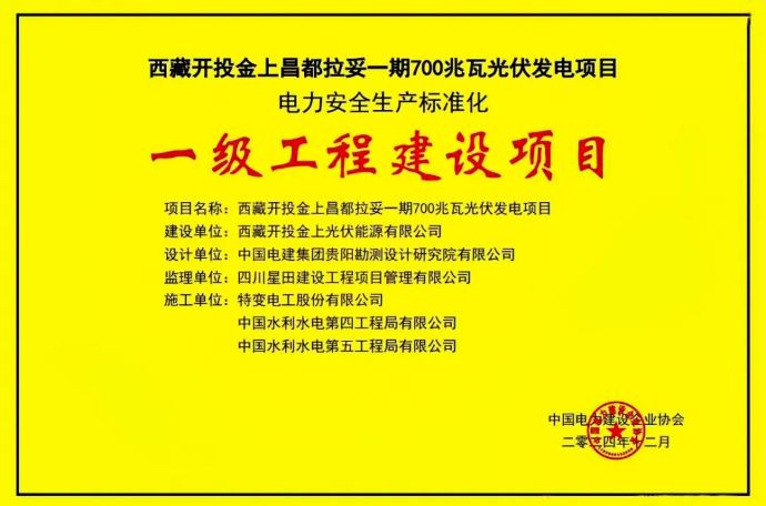 西藏開投金上昌都拉妥一期700兆瓦光伏項(xiàng)目于12月順利通過電力建設(shè)工程安全生產(chǎn)標(biāo)準(zhǔn)化一級評審,榮獲中國電力建設(shè)企業(yè)協(xié)會(huì)頒發(fā)的“電力安全生產(chǎn)標(biāo)準(zhǔn)化一級工程建設(shè)項(xiàng)目”榮譽(yù)。