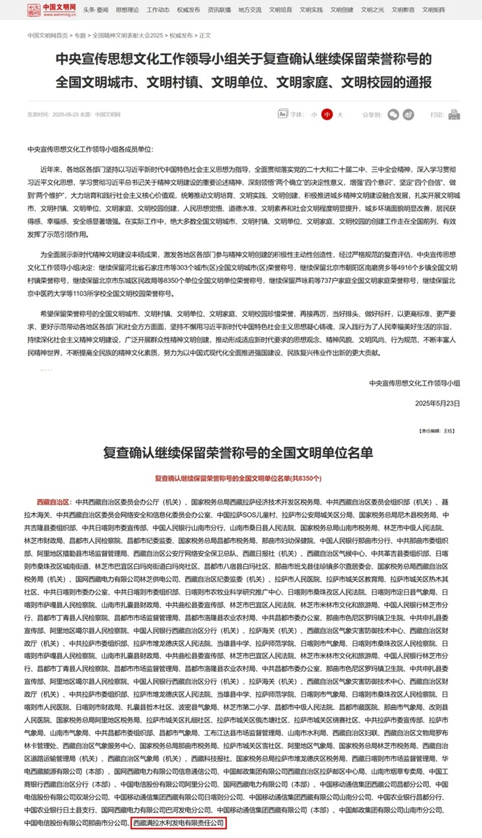 延續(xù)17年!滿拉水電公司再獲“全國文明單位”榮譽稱號