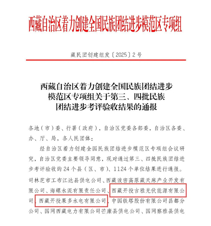 近日,西藏自治區(qū)著力創(chuàng)建全國民族團(tuán)結(jié)進(jìn)步模范區(qū)專項(xiàng)組印發(fā)《西藏自治區(qū)著力創(chuàng)建全國民族團(tuán)結(jié)進(jìn)步模范區(qū)專項(xiàng)組關(guān)于第三、四批民族團(tuán)結(jié)進(jìn)步考評(píng)驗(yàn)收結(jié)果的通報(bào)》,西藏開投吉雅光伏公司、果多水電公司位列第四批考評(píng)驗(yàn)收單位名單。