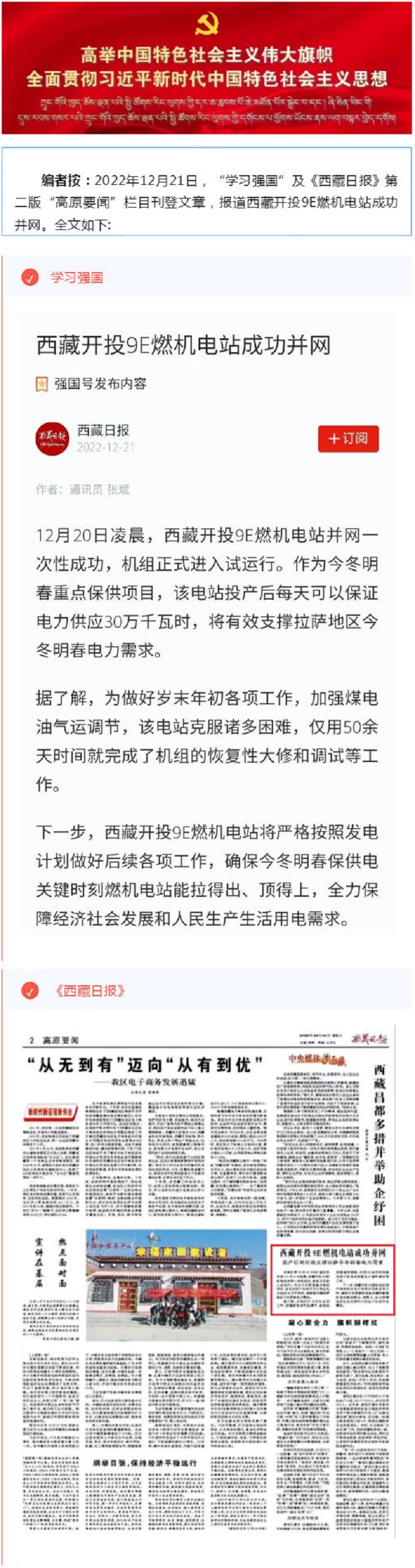 “學(xué)習(xí)強(qiáng)國”、《西藏日報(bào)》報(bào)道西藏開投9E燃機(jī)電站成功并網(wǎng)