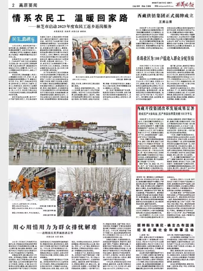 編者按:12月9日,西藏日報(bào)第二版高原要聞欄目報(bào)道了《西藏開投集團(tuán)改革發(fā)展成果顯著建成投產(chǎn)9座電站,投產(chǎn)總裝機(jī)容量突破100萬千瓦》文章。全文如下: