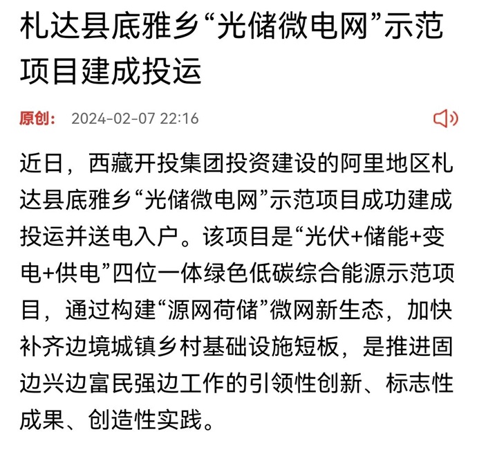 編者按:2月7日,西藏日?qǐng)?bào)發(fā)表《札達(dá)縣底雅鄉(xiāng)“光儲(chǔ)微電網(wǎng)”示范項(xiàng)目建成投運(yùn)》文章。全文如下: