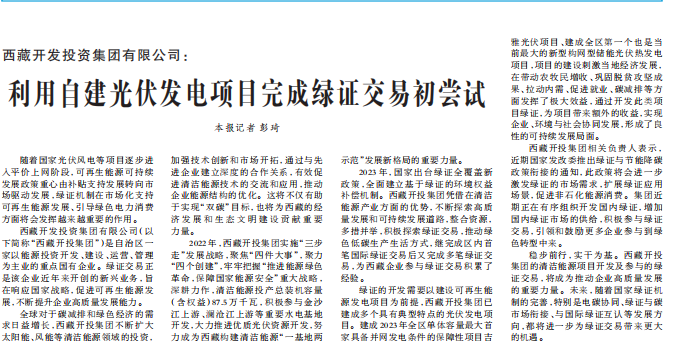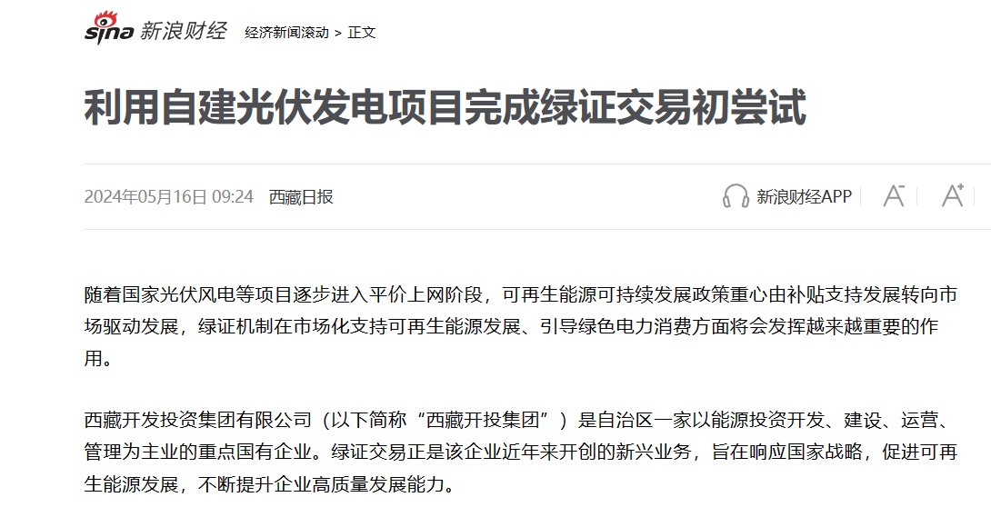 西藏日報(bào)、新浪財(cái)經(jīng)等媒體報(bào)道利用自建光伏發(fā)電項(xiàng)目完成綠證交易初嘗試