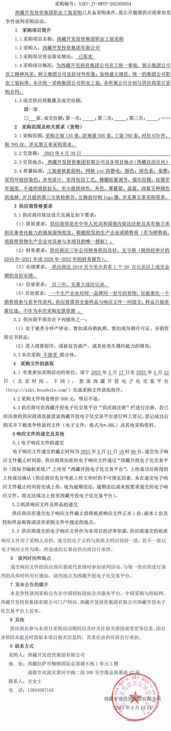 西藏開發(fā)投資集團(tuán)職業(yè)工裝采購(gòu)競(jìng)爭(zhēng)性談判采購(gòu)公告