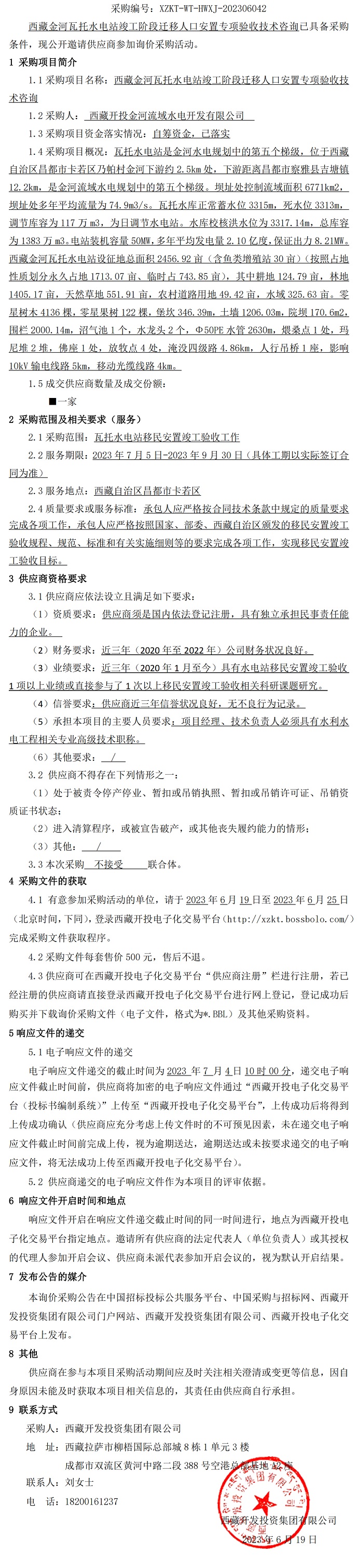 西藏金河瓦托水電站竣工階段遷移人口安置專項(xiàng)驗(yàn)收技術(shù)咨詢?cè)儍r(jià)采購公告