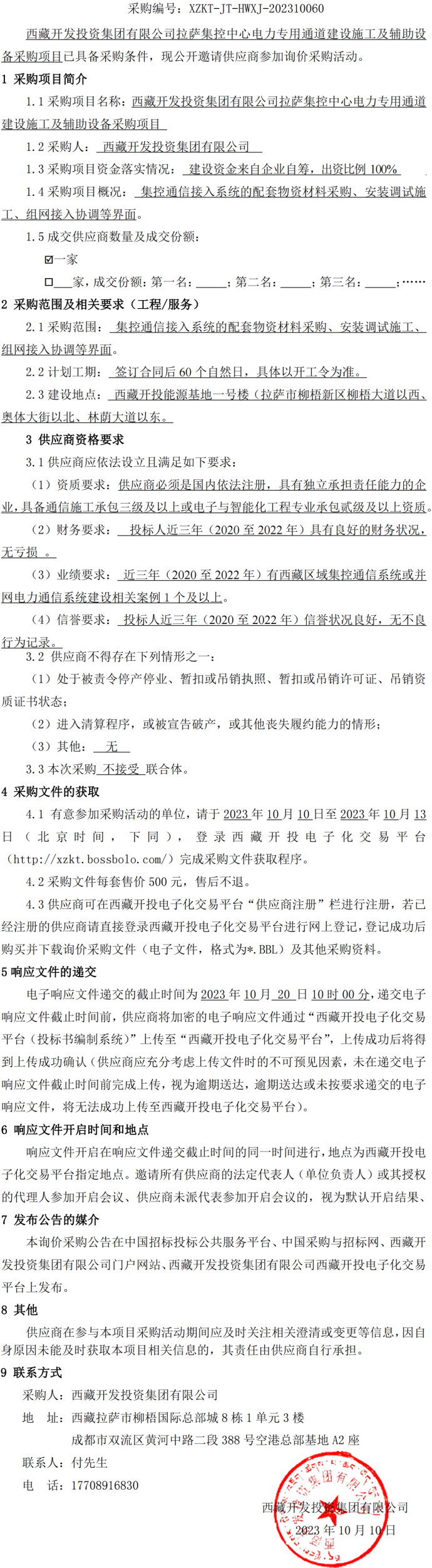 西藏開發(fā)投資集團有限公司拉薩集控中心電力專用通道