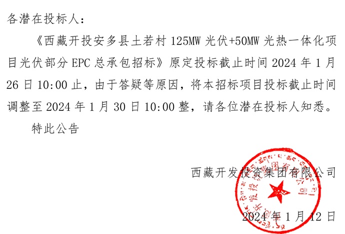 體化項(xiàng)目光伏部分EPC總承包招標(biāo)》投標(biāo)截止時(shí)間的公告