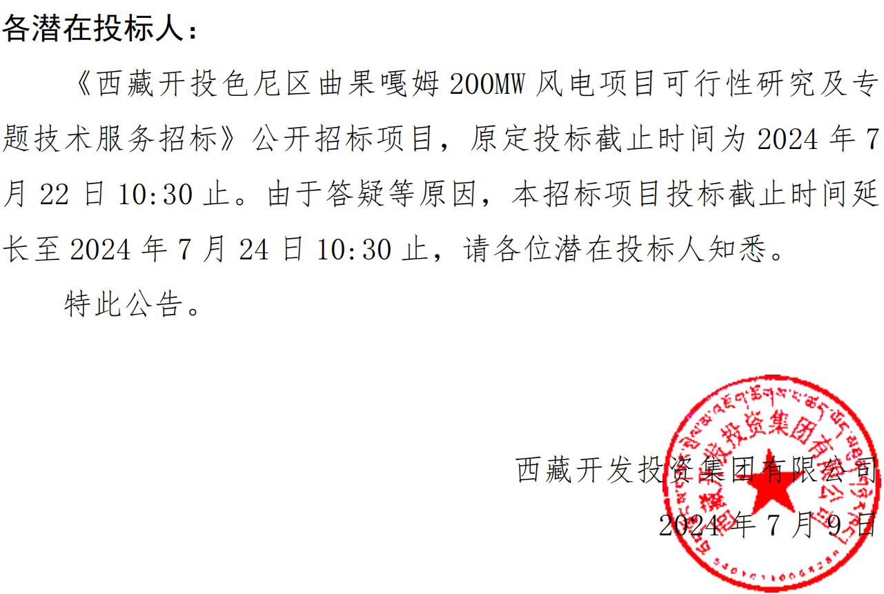 關(guān)于延長(zhǎng)《西藏開(kāi)投色尼區(qū)曲果嘎姆200MW風(fēng)電項(xiàng)目可行性研究及專(zhuān)題技術(shù)服務(wù)招標(biāo)》投標(biāo)截止時(shí)間的公告