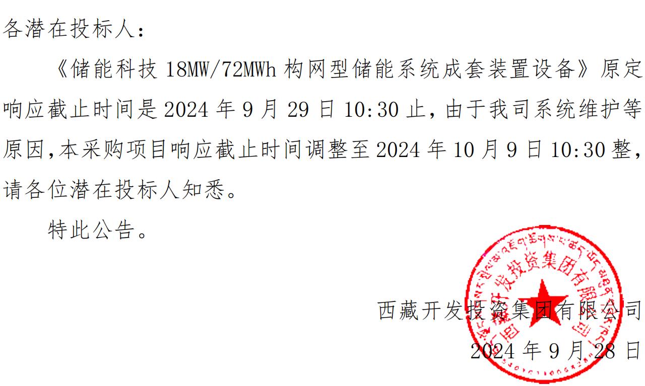 關(guān)于延長《儲(chǔ)能科技 18MW/72MWh 構(gòu)網(wǎng)型儲(chǔ)能系統(tǒng)成套裝置設(shè)備》競爭性談判采購響應(yīng)截止時(shí)間的公告