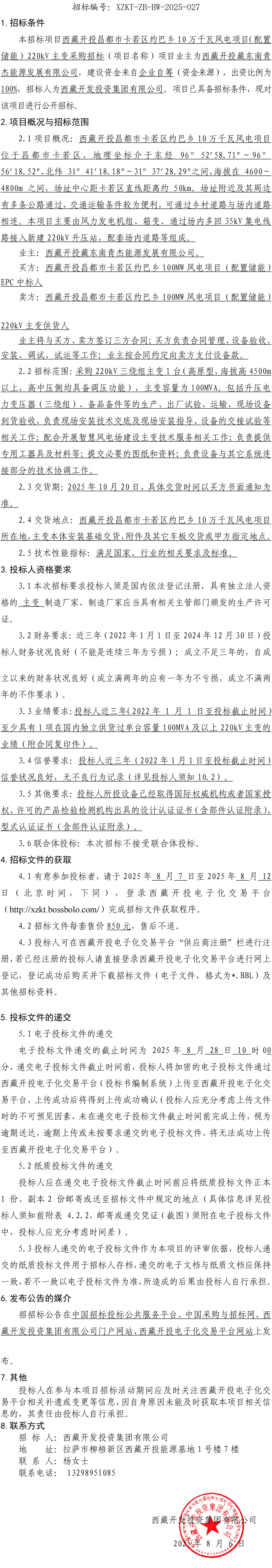 西藏開投昌都市卡若區(qū)約巴鄉(xiāng) 10 萬千瓦風(fēng)電項(xiàng)目(配置儲(chǔ)能)220kV 主變采購(gòu)招標(biāo)公告