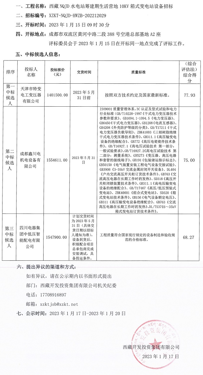 西藏NQJD水電站籌建期生活營地10KV箱式變電站設(shè)備招標(biāo)中標(biāo)候選人公示